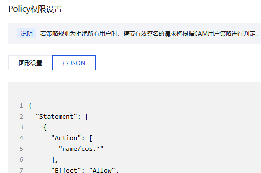 除了使用图形化配置,熟悉存储桶策略的用户可以直接使用 JSON 语言编写策略。