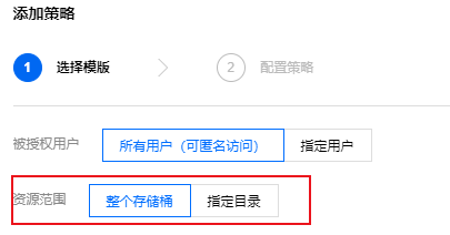 整个存储桶:当您希望授予存储桶配置项相关权限,或者将资源范围指定为整个存储桶,选择此项,在第二步配置策略时会为您自动添加整个存储桶为资源。