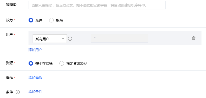 当效力为允许时,所有用户的生效范围包含匿名用户、子账号、主账号等所有用户。