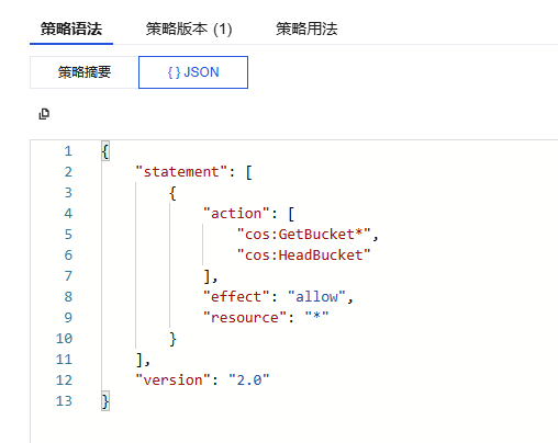 "*")"qcs::cos:ap-guangzhou:uid/1250000000:examplebucket-1250000000/*")"qcs::cos:ap-guangzhou:uid/1250000000:examplebucket-1250000000/test/*")"allow"(允许)或"deny"(拒绝)。resource)被设置为 COS 所有资源("*"),且不支持修改。若您需要对部分 COS 存储桶、对象授权,可以复制 JSON 的预设策略,创建 自定义策略。
