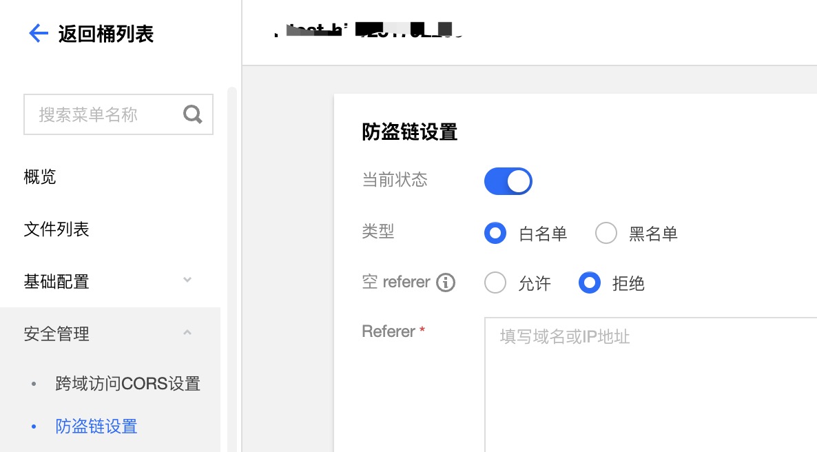 在 COS 控制台-存储桶详情页-安全管理可以找到防盗链设置: