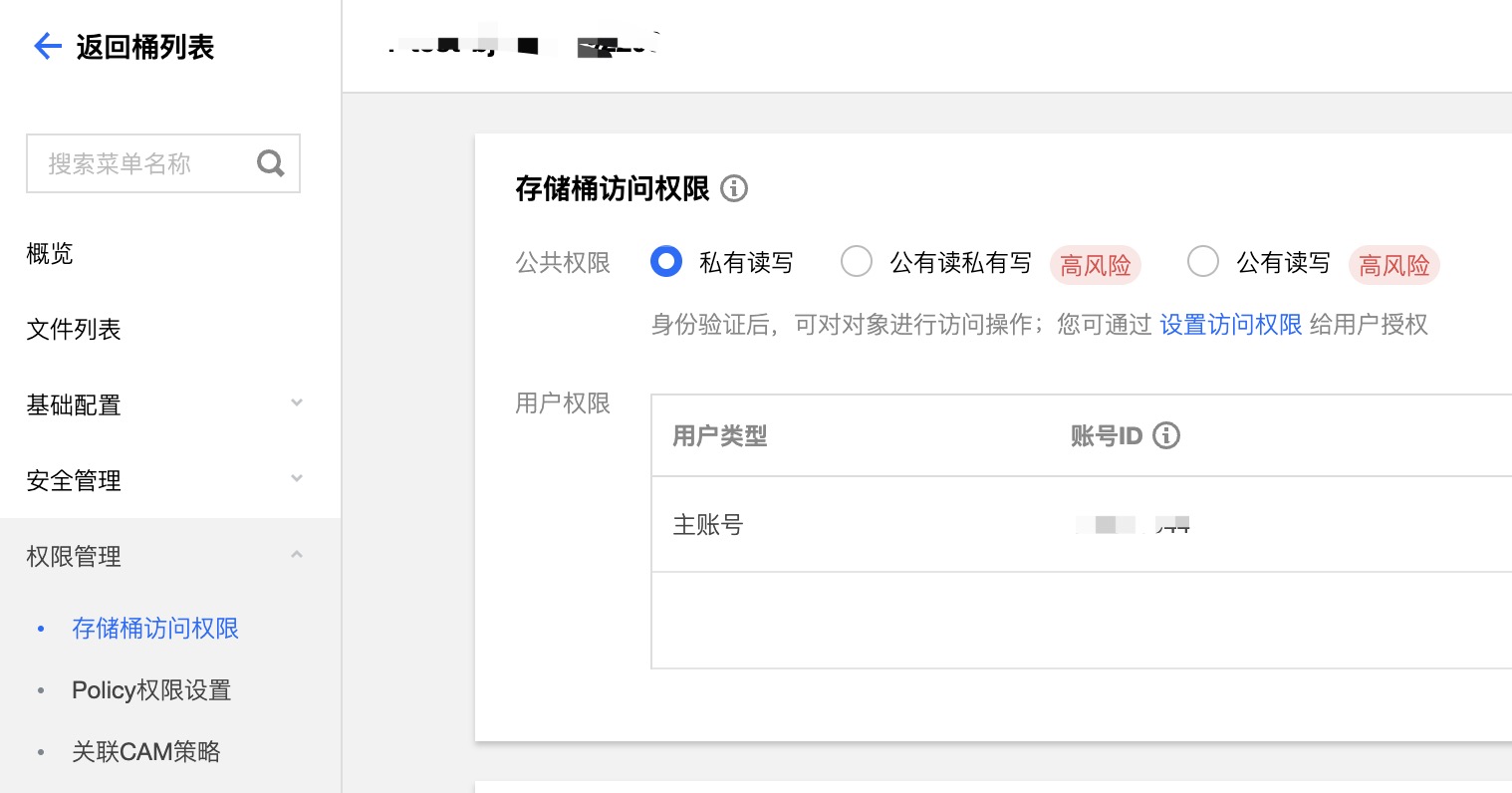 如果业务没有特别需求,这里建议您平时尽量配置私有读写权限。COS 控制台目前有两个地方可以设置存储桶权限: