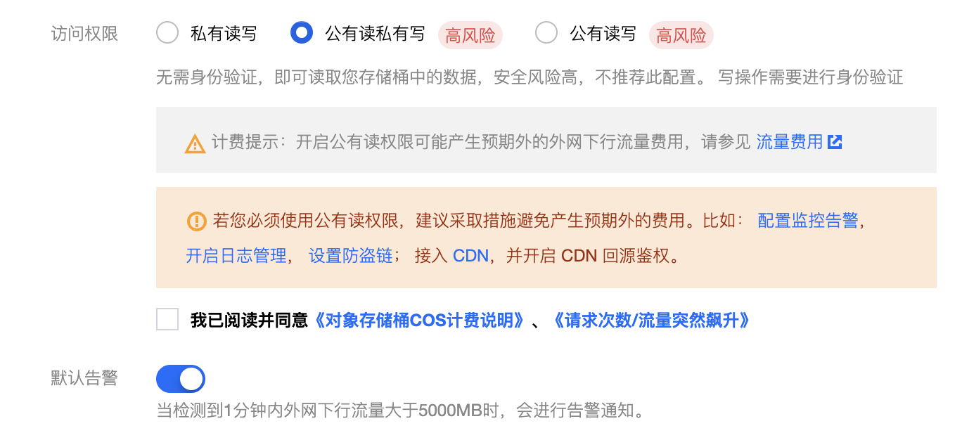 这里建议您空 referer 配置为拒绝,黑白名单可根据业务实际情况来选择,如果是固定在某些域名下访问可设置白名单,如已经发现有恶意访问并明确知道访问域名或 IP,可手动设置黑名单来拦截。如需了解更多防盗链的使用技巧,可参考 防盗链实践。 配置日志管理能帮助定位和分析盗刷的来源,提供了丰富的字段可查询,但缺点是需要开发者主动去关注日志。如需更加及时的发现盗刷问题,可以配置云监控告警。目前 COS 控制台创建存储桶时,就支持同时配置告警: