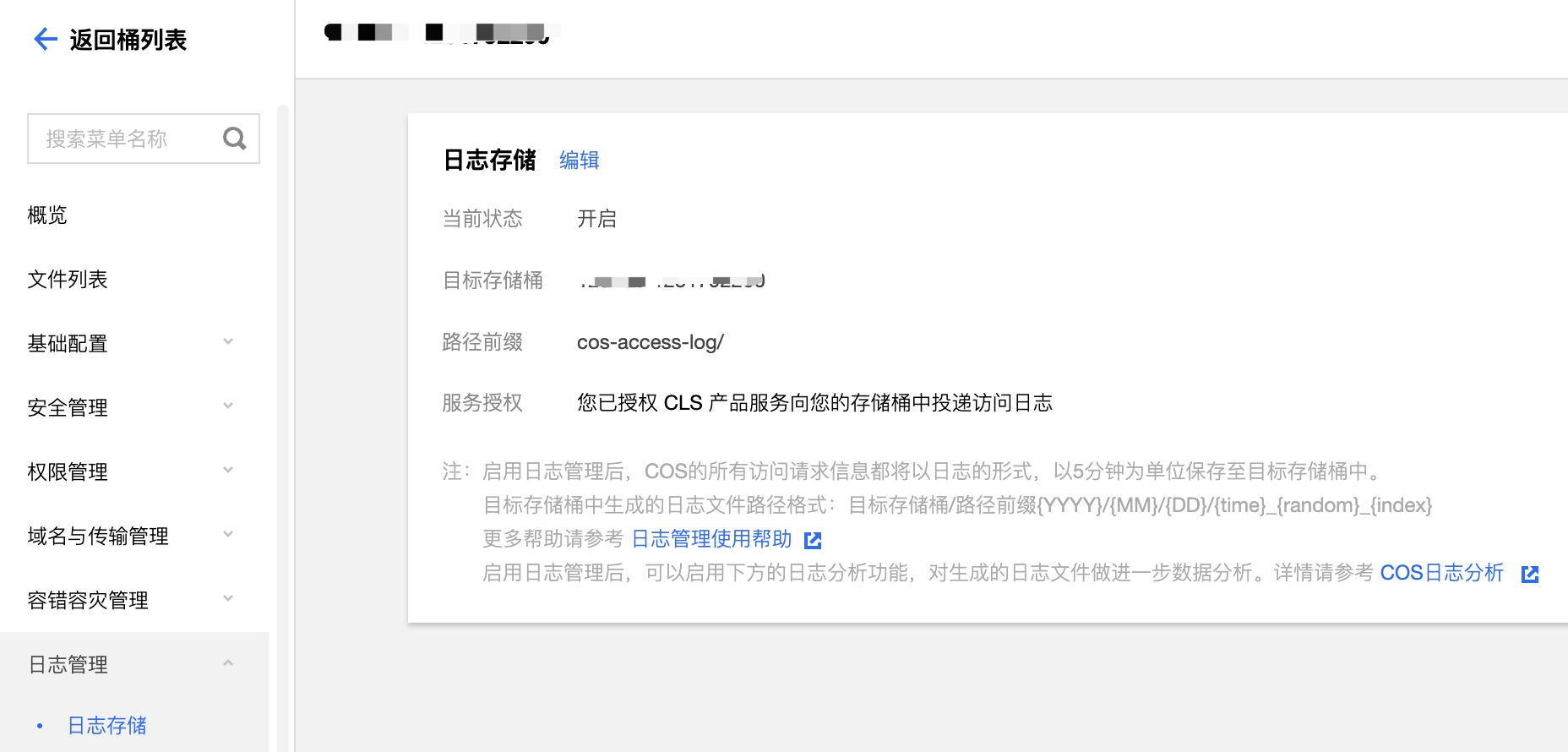 在 COS 控制台-存储桶详情页-日志管理可以找到日志存储,开启后即可在存储桶指定的路径前缀下找到访问日志。