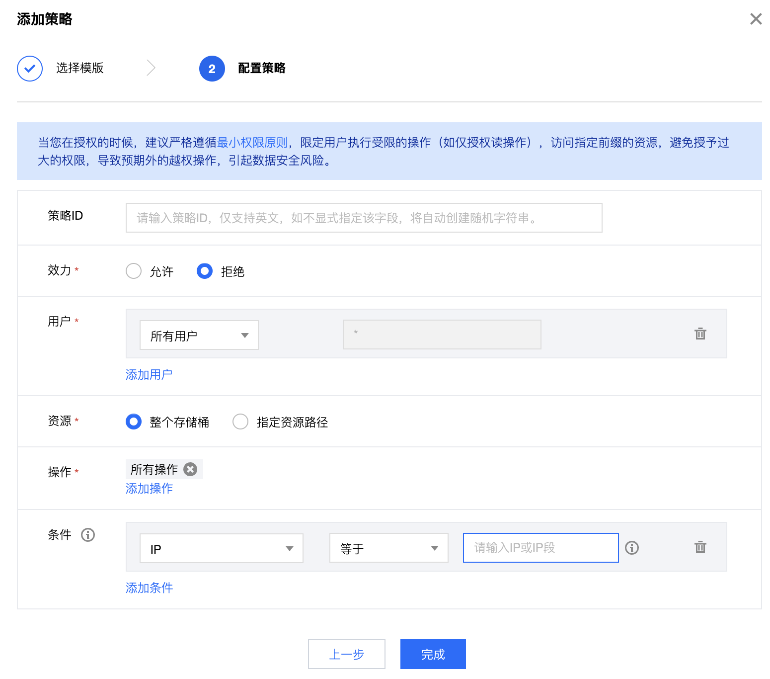 remoteIp:可以确定访问来源 IP,如发现是不可信任的 IP,可前往存储桶详情页-权限管理-Policy权限设置,点击添加策略,配置 Policy 禁止该 IP 访问存储桶,示例如下: