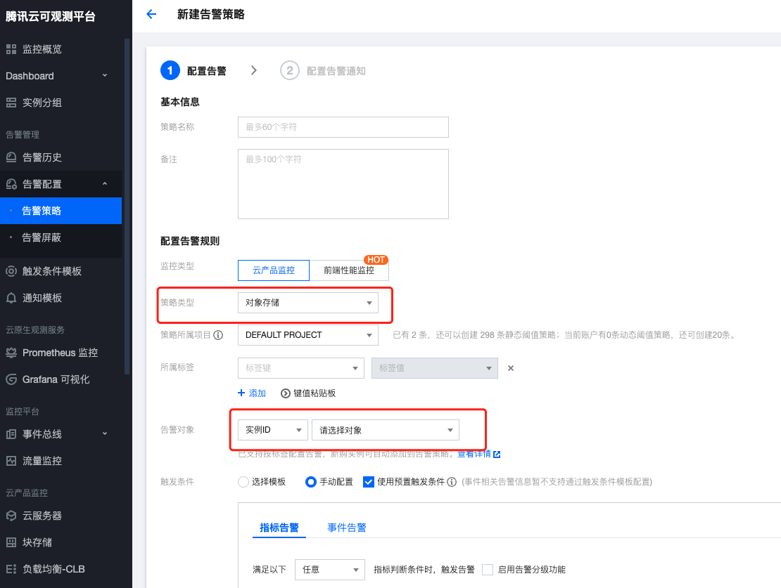 如果默认告警的策略不能满足要求,也可以手动去 腾讯云可观测平台 创建自定义的告警策略: 进入告警配置-告警策略,点击新建策略,在云产品监控下找到对象存储,然后在告警对象的实例 ID 里找到需要配置的存储桶,就可以自己指定触发条件了,所有 COS 存储桶的数据监控页面里展示的指标,这里都支持配置。