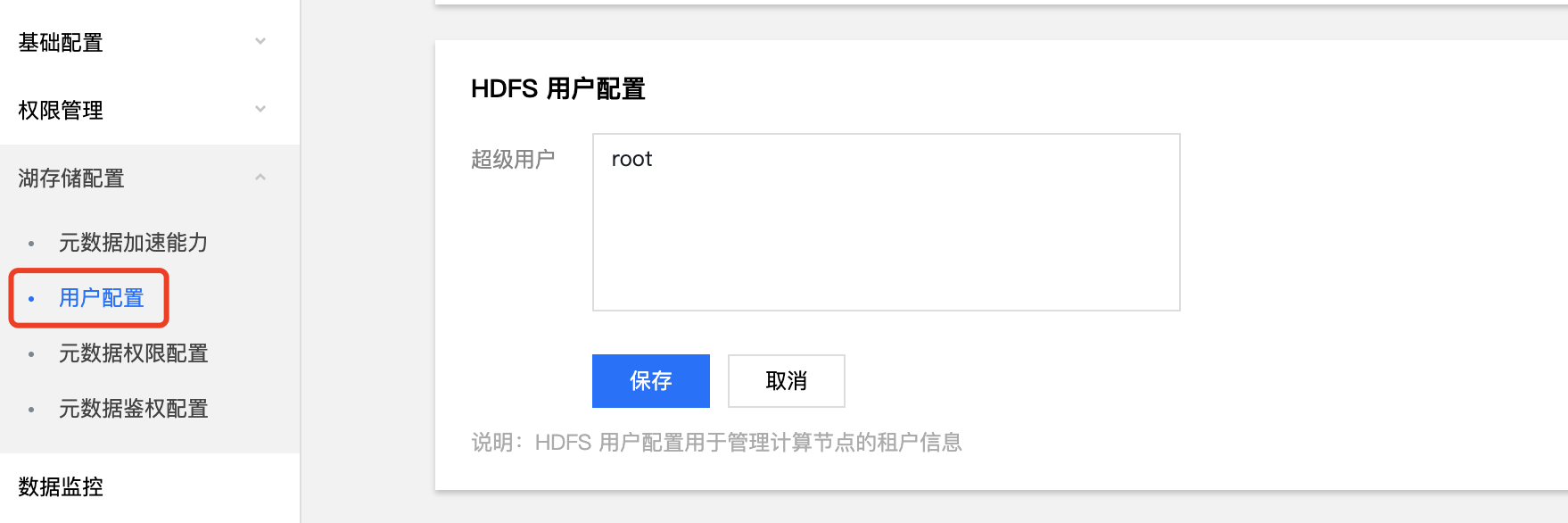 若您需要使用 POSIX 鉴权,您可在 HDFS 用户配置中配置超级用户列表,如下图所示。