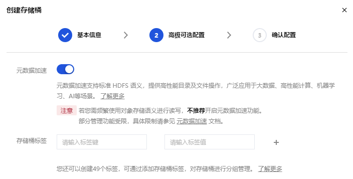 元数据加速功能只能在创建存储桶时开启,开启后不支持关闭,请结合您的业务情况慎重考虑是否开启。