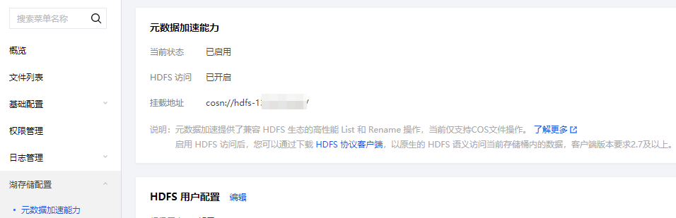 开启元数据加速的存储桶,完全兼容 HCFS(Hadoop Compatible File System,HCFS) 协议,可以采用原生的 HDFS 接口直接访问。