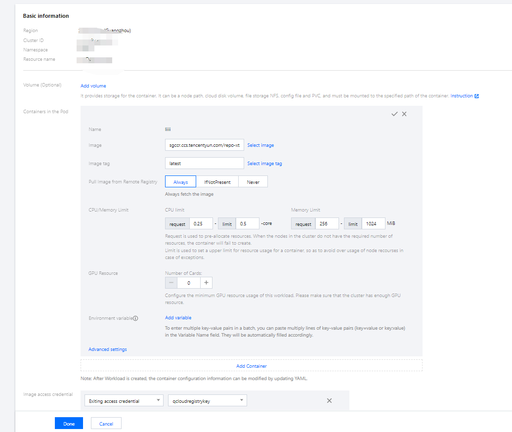 镜像访问凭证:容器镜像默认私有,在创建工作负载时,需选择实例对应的镜像访问凭证。