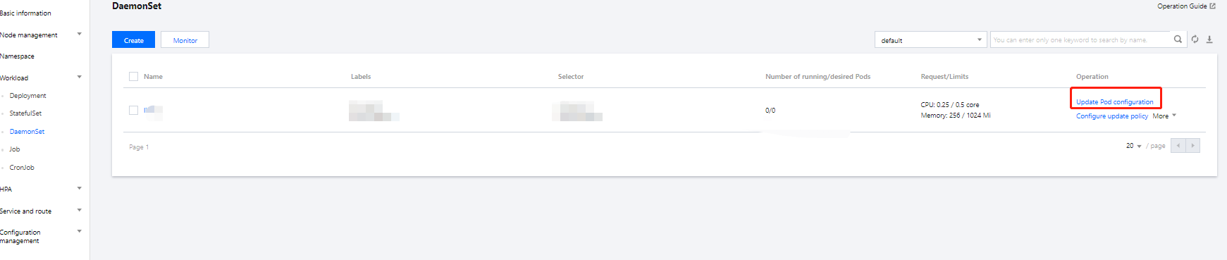 2. 在需要更新 Pod 配置的 DaemonSet 行中,单击更新 Pod 配置。如下图所示:
