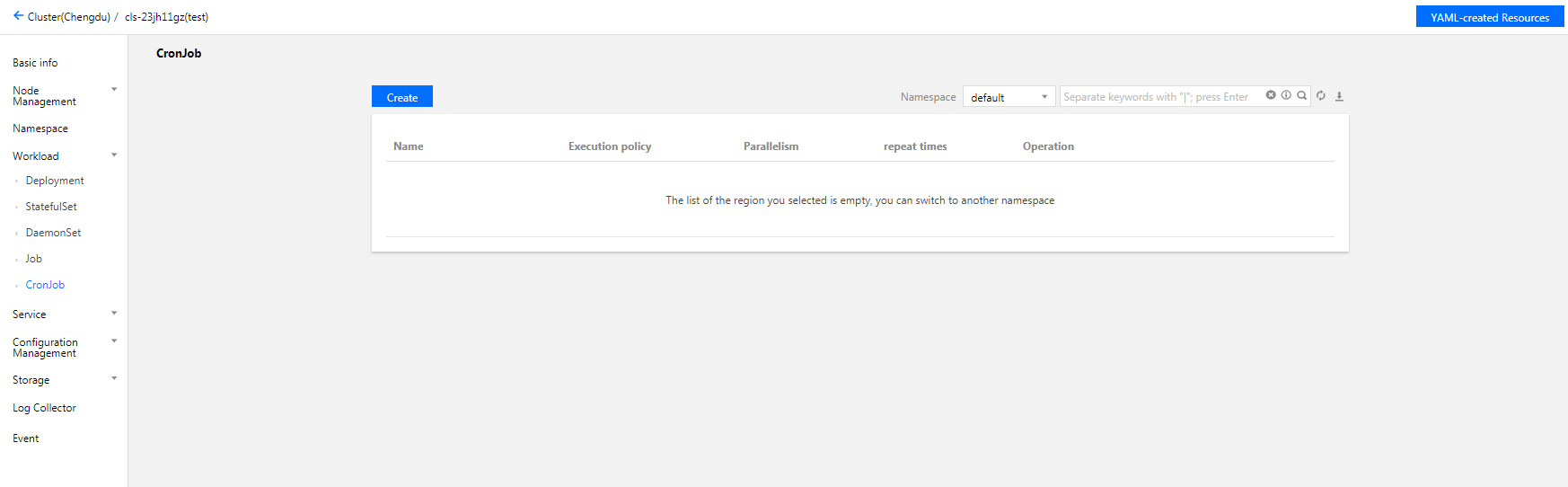 4. 选择工作负载 > CronJob,进入 CronJob 信息页面。如下图所示: