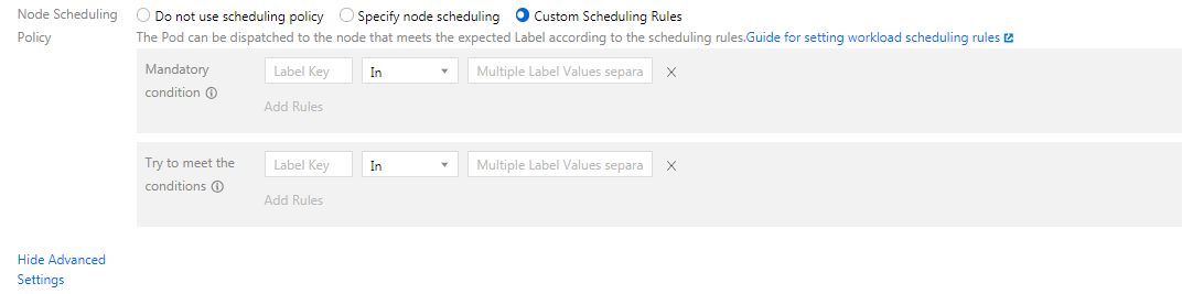 通过设置工作负载中高级设置的调度规则,指定该工作负载下的 Pod 在集群内进行调度。 存在以下应用场景: