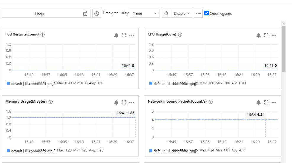 3. 选择工作负载名称,在该工作负载的 Pod 管理页签中,单击实例名称前的,即可查看该 Pod 的 Container 信息。 4. 单击,即可查看该 Pod 内 Container 的监控指标对比图。如下图所示: