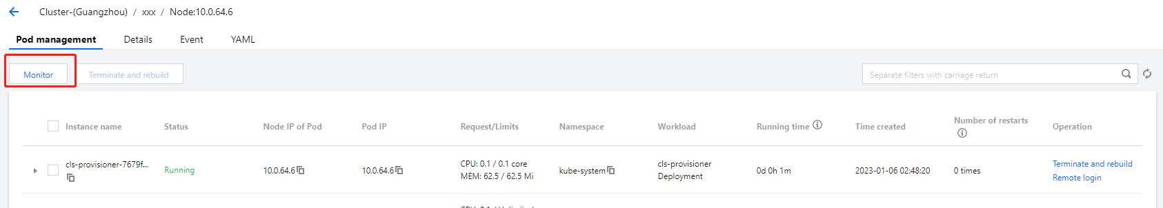 3. 选择节点名称,在 Pod 管理页签中单击监控,即可查看到该节点内 Pod 的监控指标曲线图。如下图所示: