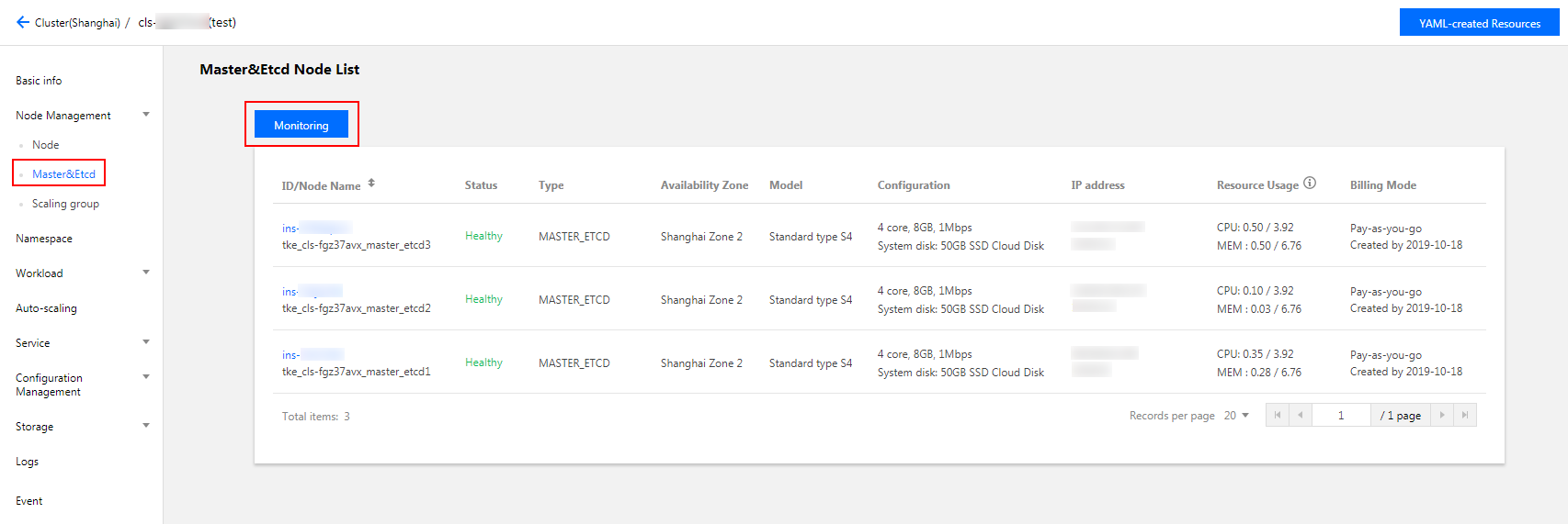 您可以通过以下操作查看节点和 Master&Etcd 节点的监控信息。