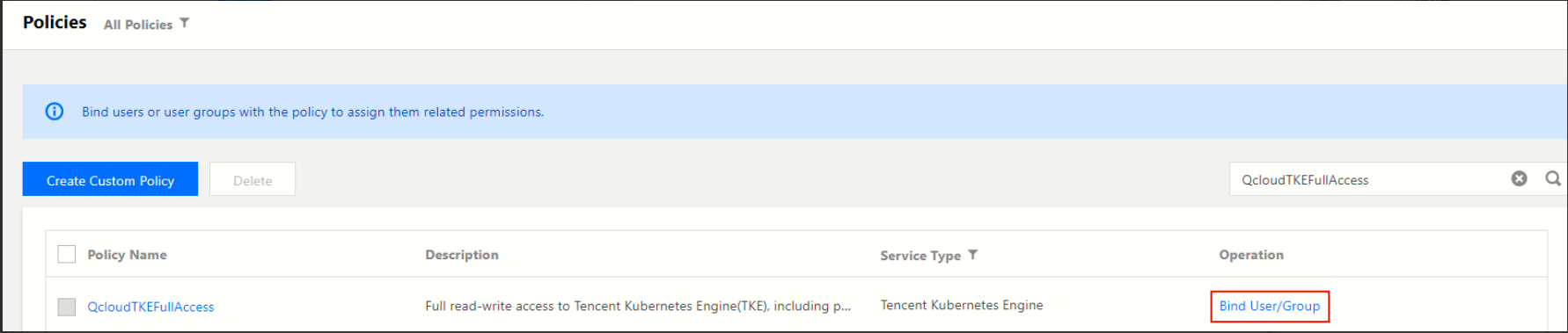 1. 登录访问管理控制台,选择左侧导航栏中的 策略 。 2. 在策略管理页面,选择 QcloudTKEFullAccess 策略行的关联用户/组/角色。如下图所示: