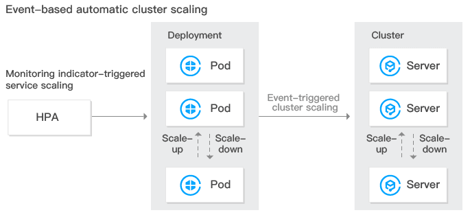 腾讯云容器服务(Tencent Kubernetes Engine,TKE)提供集群和服务两个层级的弹性伸缩能力, 能够根据业务运行情况监控容器的 CPU、内存、带宽等指标,进行自动扩缩服务。同时您可以根据容器的部署情况,在容器不够资源分配或者有过多剩余资源的情况下自动伸缩集群。如下图所示: