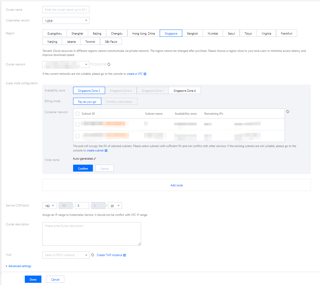 集群网络:该字段展示所在地域下您已创建的全部 VPC 网络,请选择合适的网络作为集群网络,若无可用网络信息或现有网络不合适,可跳转至控制台新建私有网络,详情请参见 私有网络(VPC),私有网络中的子网将用于 serverless 集群的容器网络。 超级节点配置: