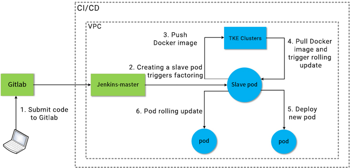用户提交代码到 Gitlab,触发 Jenkins Master 调用 slave pod 进行构建打包并推送镜像到 TKE 镜像仓库,TKE 集群拉取镜像并触发滚动更新进行 Pod 部署。