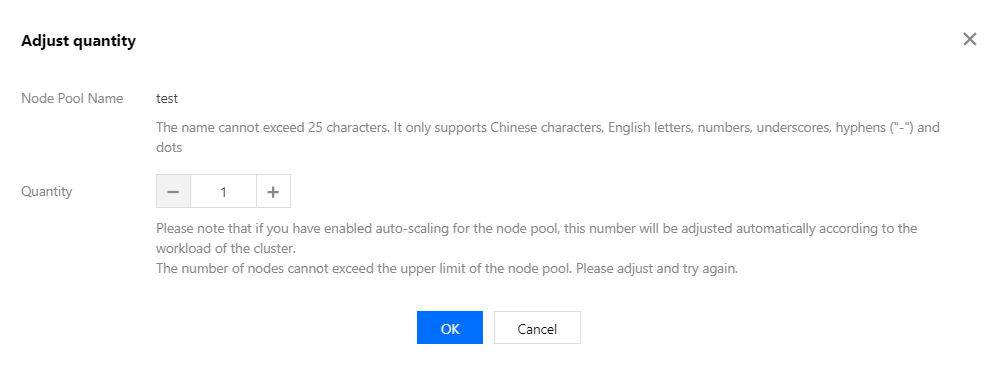 2. 在弹出的“调整数量”页面,按需调整节点数量,该数量必须落在设置的节点池数量范围内。如下图所示: