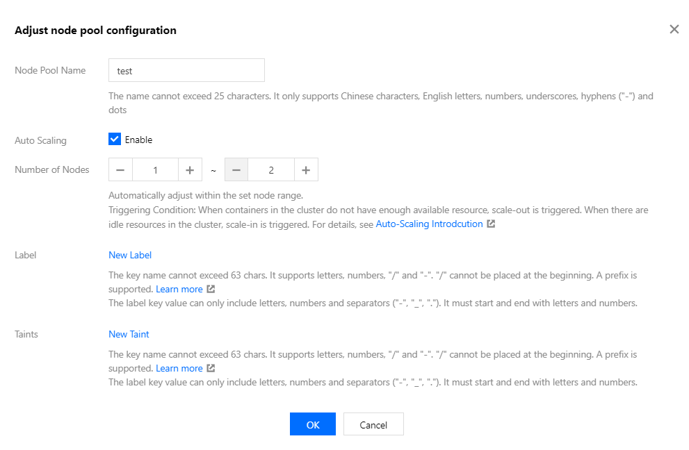 2. 在弹出的“调整节点池配置”页面,参考以下信息进行设置。如下图所示: