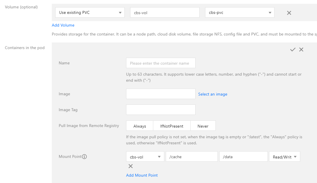 数据卷:选择该步骤中已添加的数据卷 “cbs-vol”。