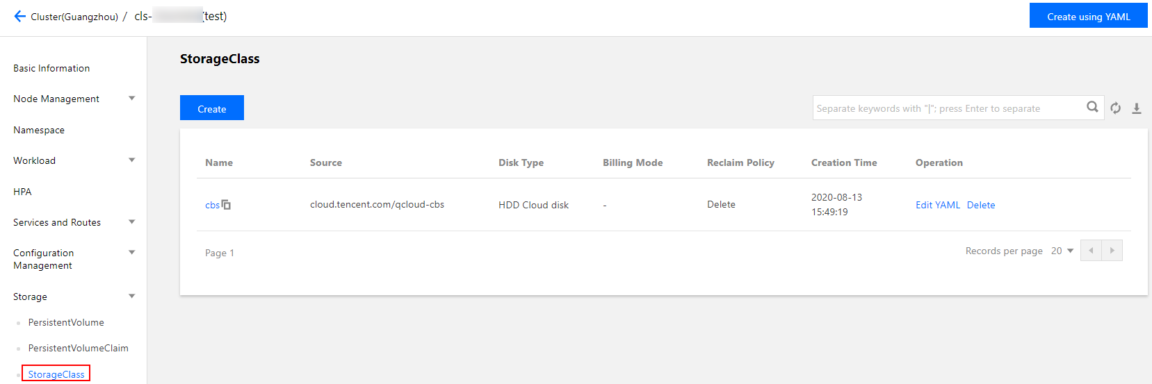 以下 YAML 文件示例为集群内默认存在 name 为 cbs 的 StorageClass: