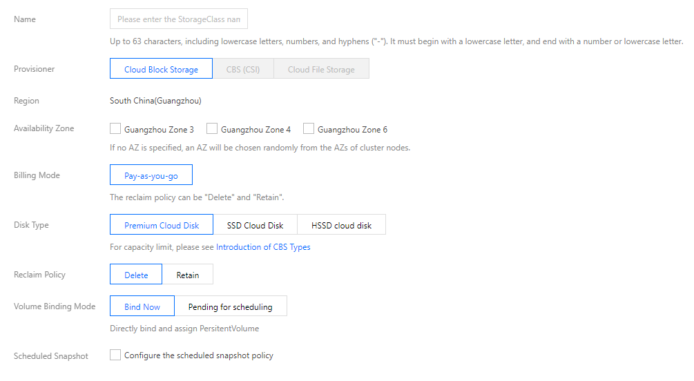 zone | 用于指定可用区。如果指定,则云硬盘将创建到此可用区。如果不指定,则拉取所有 Node 的可用区信息,进行随机选取。腾讯云各地域标识符请参见 地域和可用区。 |