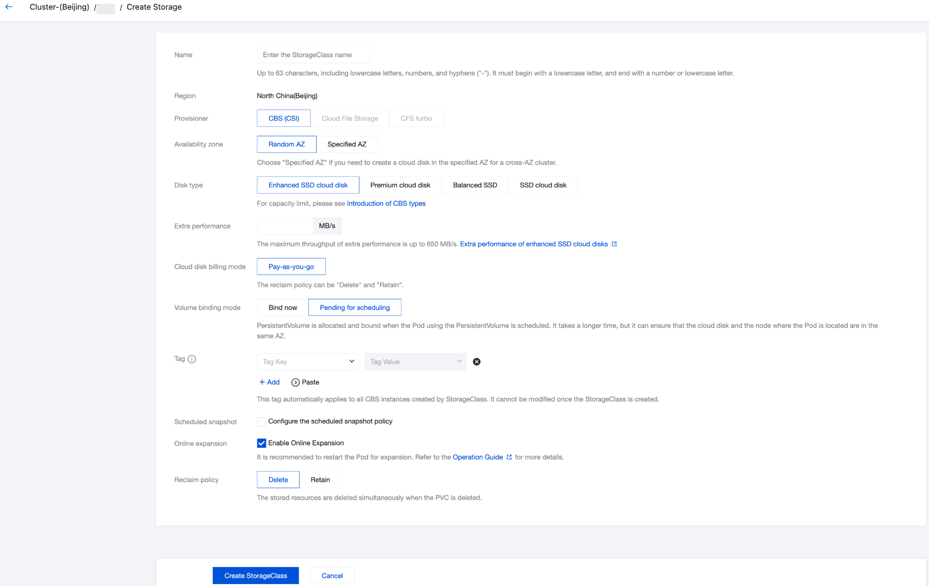 4. 单击新建进入新建StorageClass 页面,参考以下信息进行创建。如下图所示: