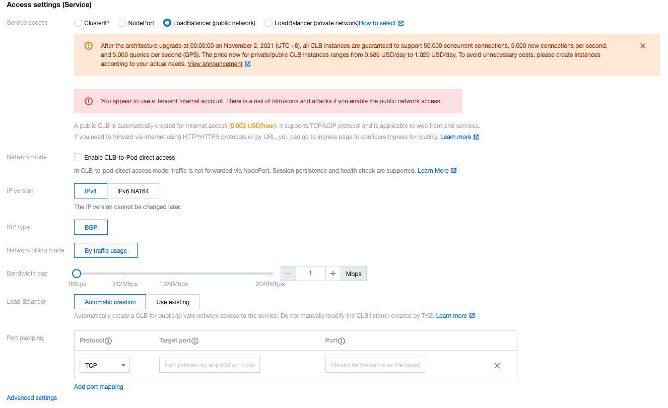 其中,部分关键参数信息需进行如下设置,如下图所示: 服务访问方式:选择为公网LB访问或内网LB访问。