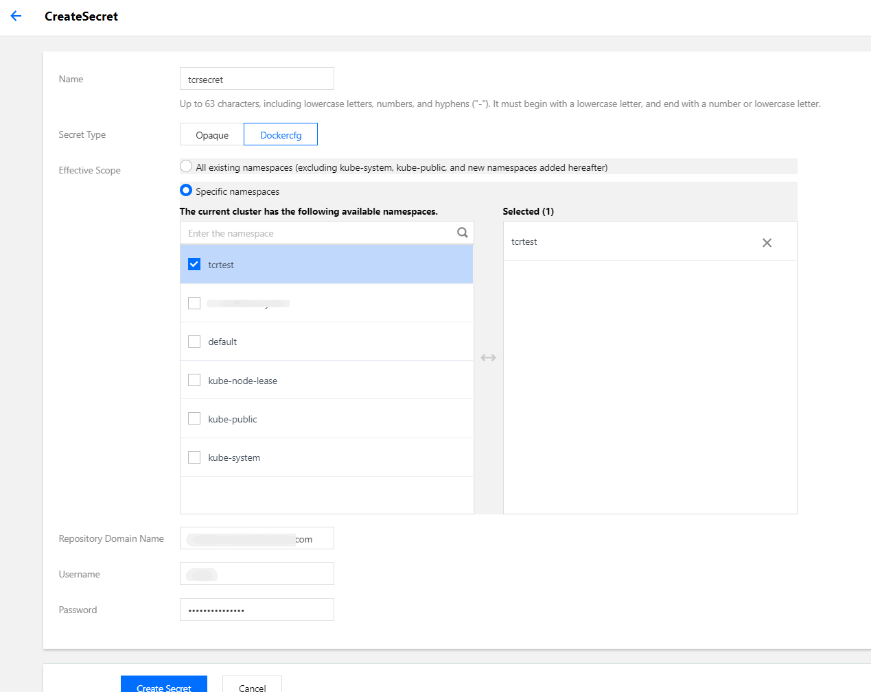 用户名、密码:填写 步骤1 已获取的用户名及密码。 4. 单击创建 Secret 即可完成下发。