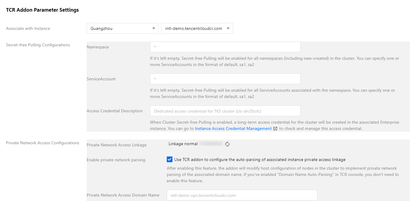 内网访问配置:可选功能,在 TCR 实例接入集群所在 VPC 并开启自动解析后,集群内节点可内网访问 TCR 实例,无需使用本功能。由于 TCR 侧自动解析功能依赖于 PrivateDNS,若当前集群所在地暂未支持 PrivateDNS 产品,可使用本配置实现内网访问。如内网访问链路中未展示为“链路正常”,请参考 内网访问控制,配置 TCR 实例与 TKE 集群所在私有网络 VPC 的内网链路。 6. 单击确定返回组件选择界面。