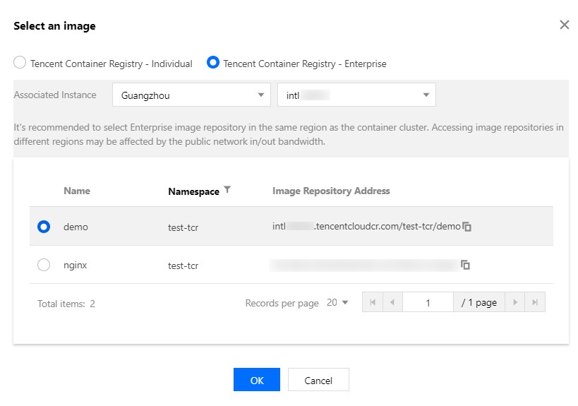 镜像:单击选择镜像,并在弹出的“选择镜像”窗口中,选择 容器镜像服务 企业版,再根据需要选择地域、实例和镜像仓库。如下图所示: