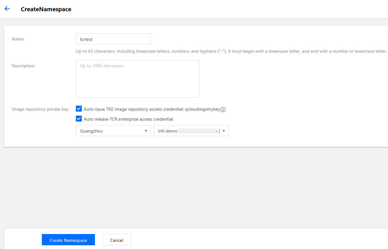 4. 进入新建 Namespace 页面,勾选“自动下发容器镜像服务企业版访问凭证”,并选择该集群需访问的 TCR 实例。如下图所示: