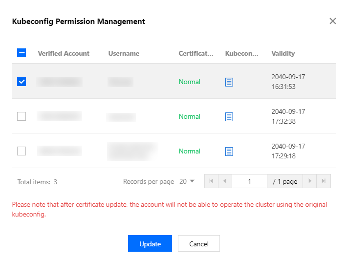 4. 在弹出的 Kubeconfig 权限管理窗口中,按需勾选认证账号并单击更新即可。如下图所示: