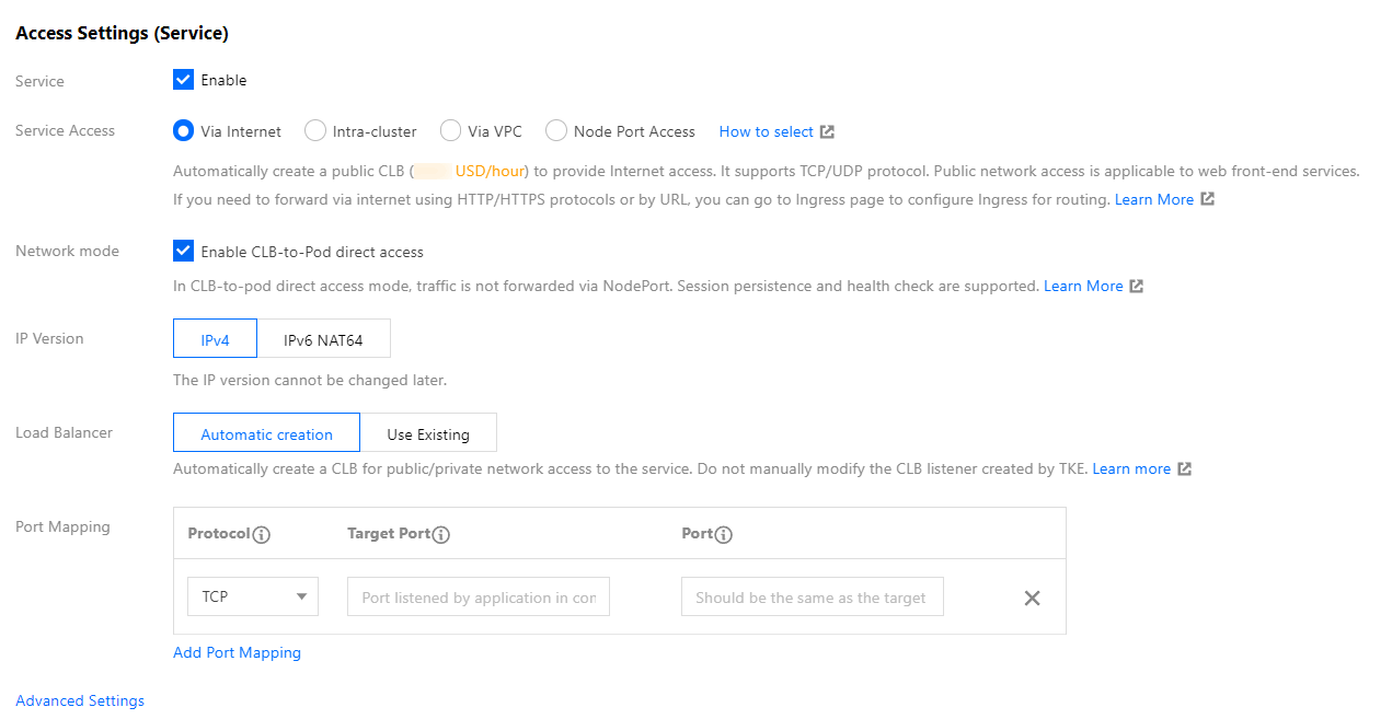 目前 CLB 直通 Pod 的实现基于弹性网卡,暂不支持普通的网络模式。 操作步骤