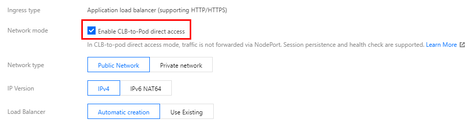 如果通过控制台创建 Ingress,可以勾选“采用负载均衡直连Pod模式”,详情请参见 创建 Ingress。如下图所示: