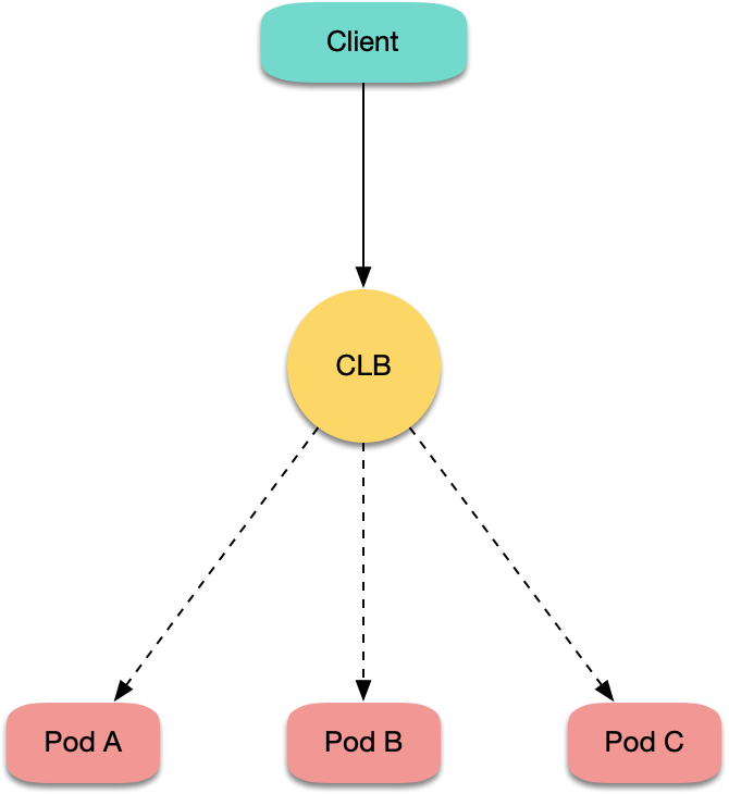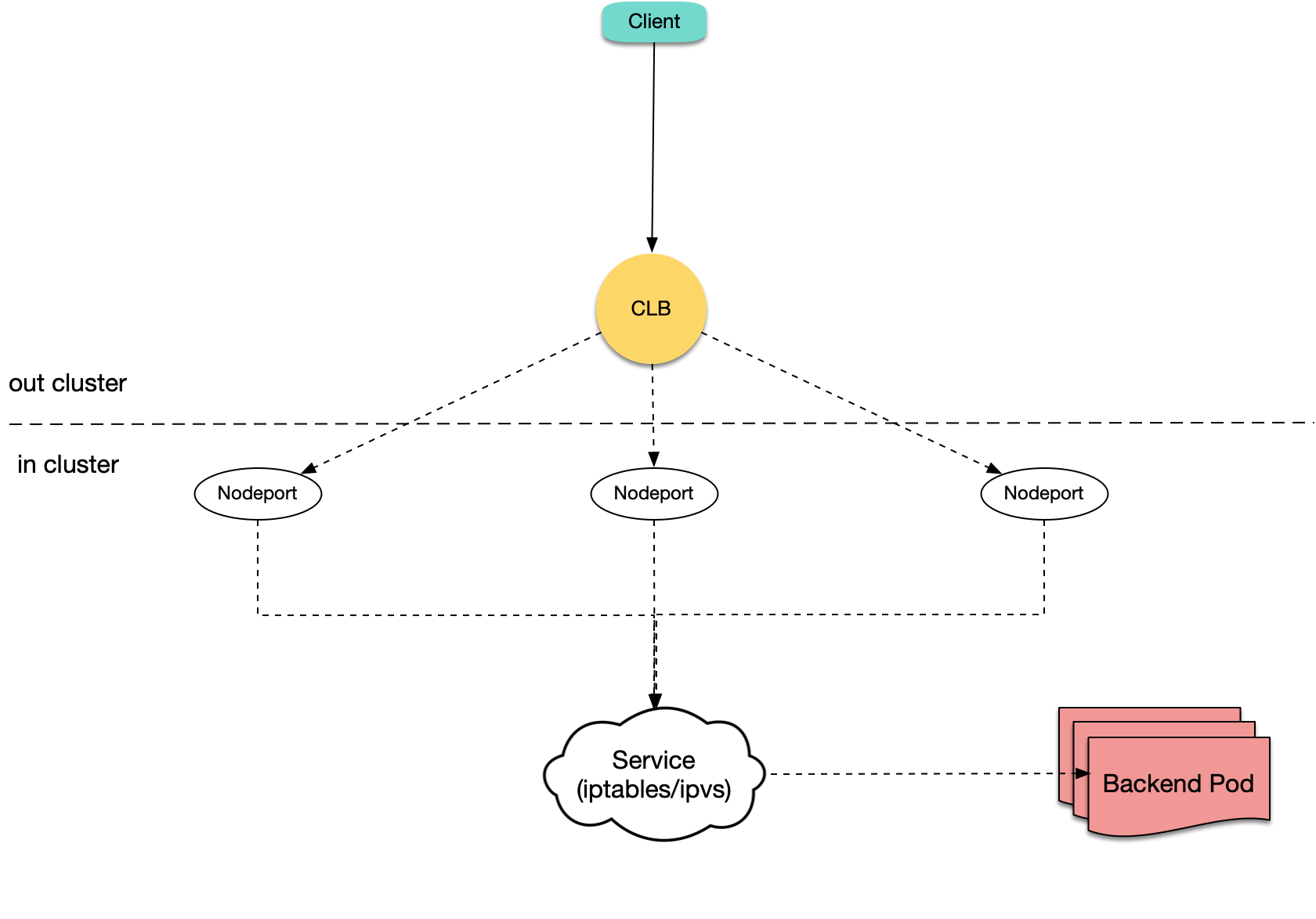 Kubernetes 官方提供了 NodePort 类型的 Service,即给所有节点开通一个相同端口用于暴露该 Service。大多云上负载均衡 (Cloud Load Balancer,CLB) 类型 Service 的传统实现也都是基于 NodePort。即 CLB 后端绑定各节点的 NodePort,CLB 接收外界流量,转发到其中一个节点的 NodePort 上,再通过 Kubernetes 内部的负载均衡,使用 iptables 或 ipvs 转发到 Pod。示意图如下:
