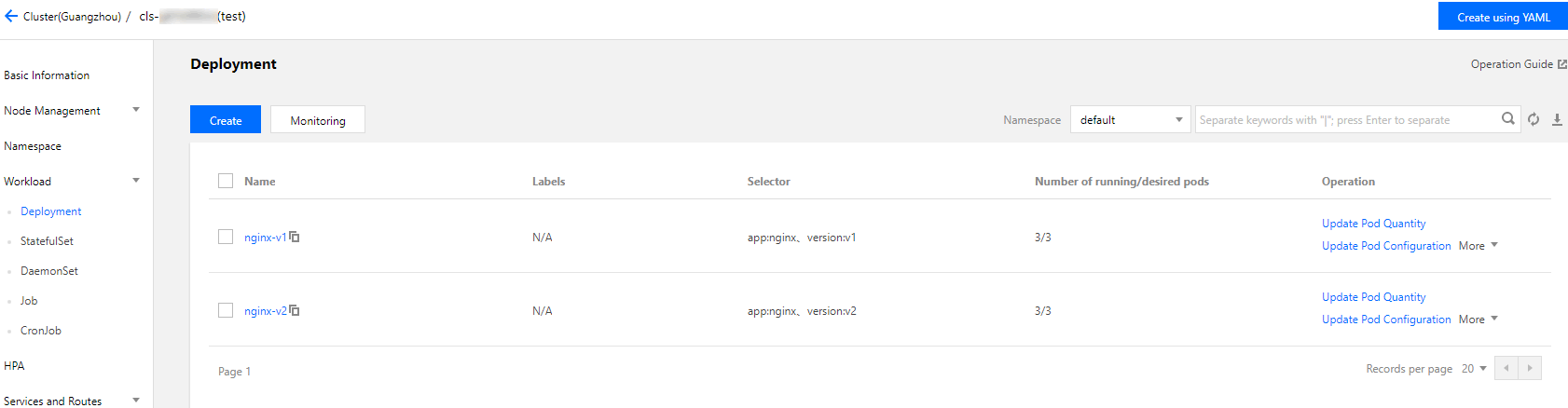 .spec.replicas 修改为1并单击完成。 .spec.replicas 修改为4并单击完成。kubectl scale deployment/nginx-v1 --replicas=1kubectl scale deployment/nginx-v2 --replicas=4