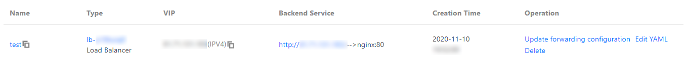 安装完成后,会在容器服务控制台自动为 Nginx Ingress Controller 服务创建一个 CLB(四层)访问入口,如下图所示: