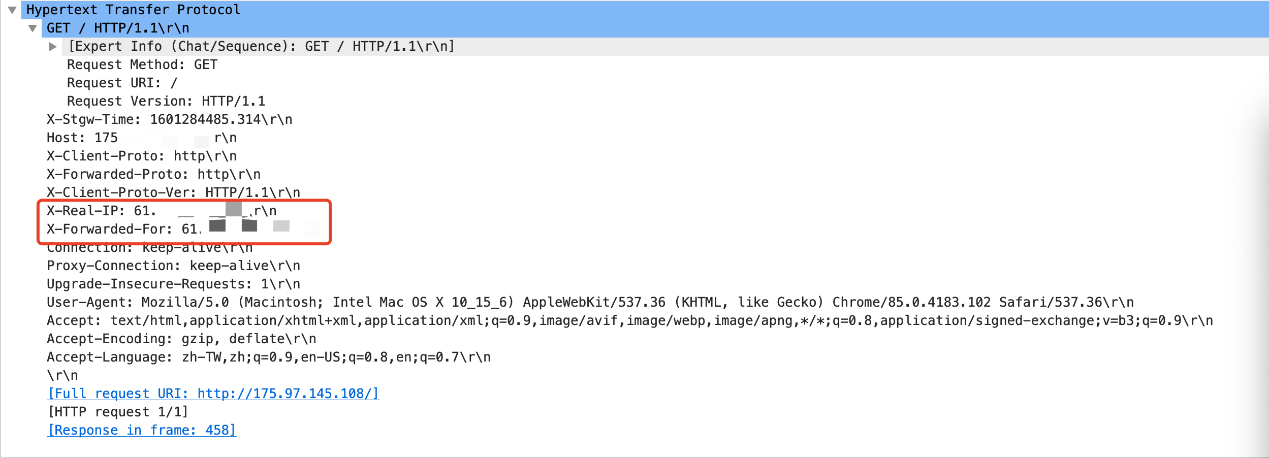 3. 待配置生效后,在后端通过获取 HTTP Header 中的 X-Forwarded-For 或 X-Real-IP 字段值得到客户端真实源 IP。后端抓包测试结果示例如下图所示: