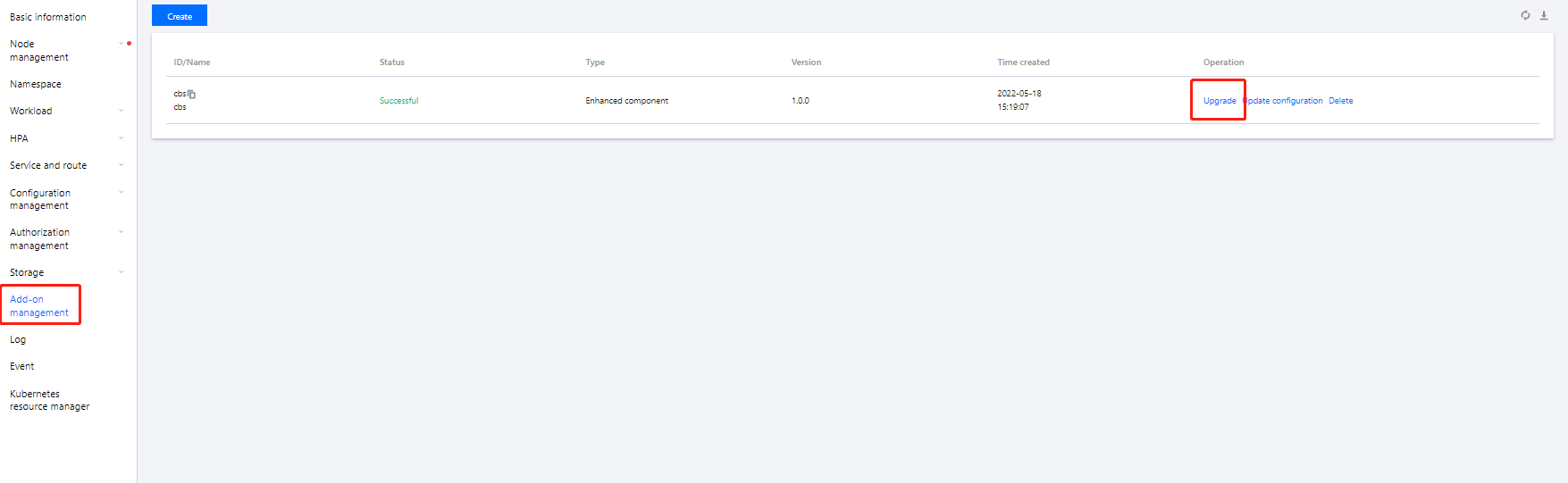4. 在组件列表页面中,单击需要升级组件所在行右侧的升级,如下图所示: