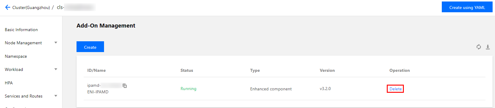 4. 在组件列表页面中,单击需要删除组件所在行右侧的删除,如下图所示: