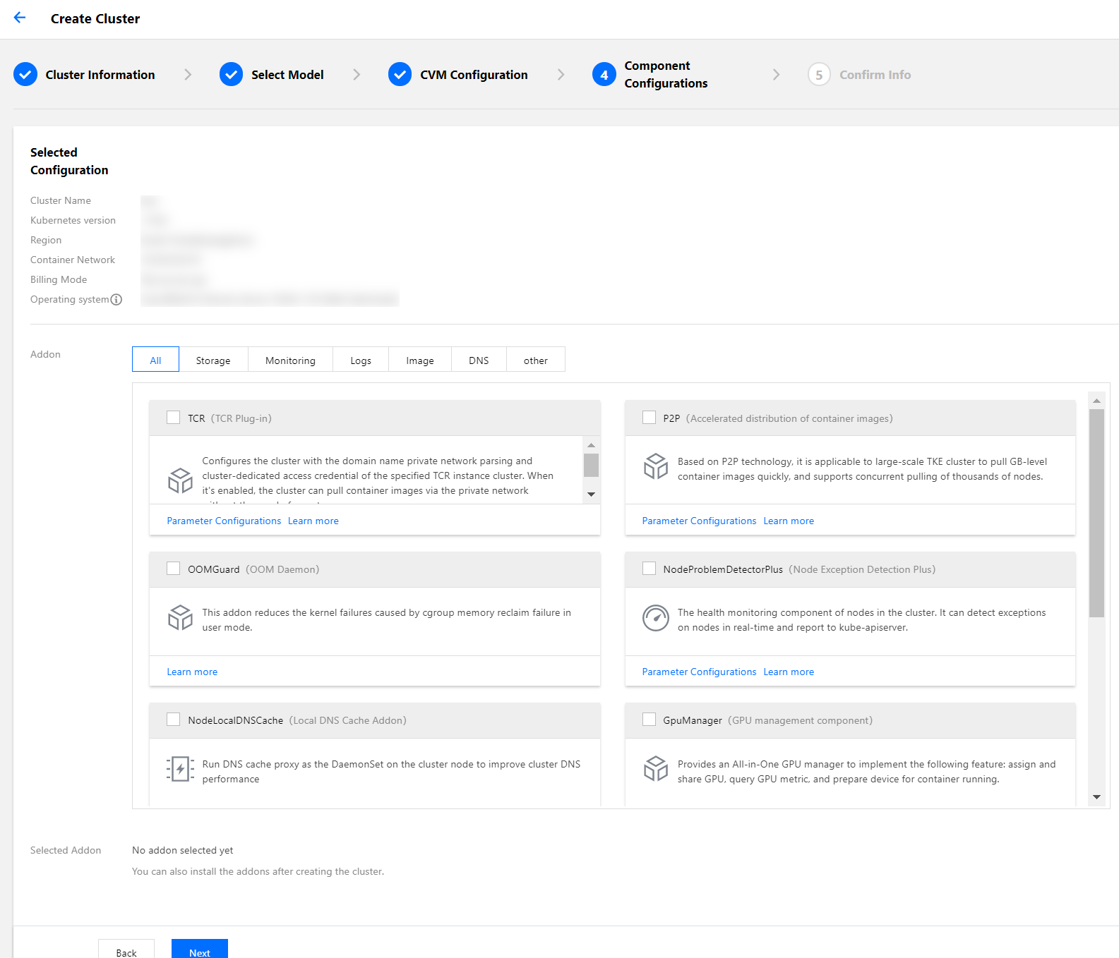3. 在创建集群页面,依次填写集群的集群信息、选择机型、云服务器配置及组件配置。如下图所示: