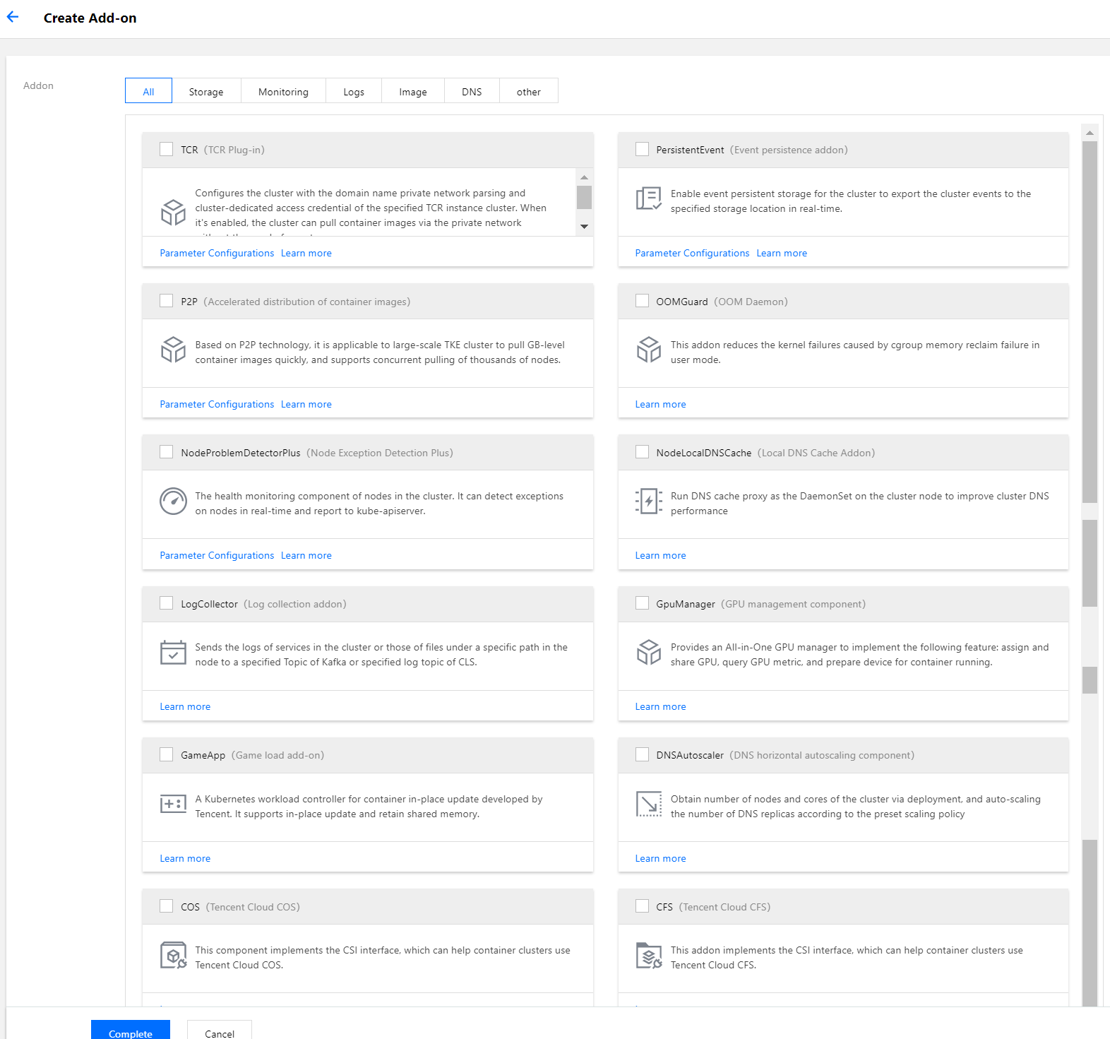 您可以根据业务部署情况,按需选择合适的组件安装。单击每个组件卡片的查看详情可以查看该组件的介绍,部分组件需要您先完成参数配置。 说明: