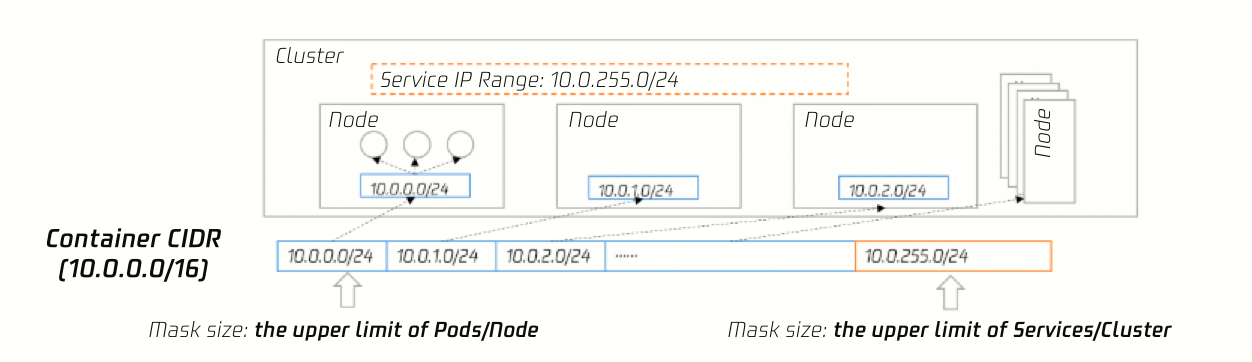 集群的每一个节点会使用容器 CIDR 中的指定大小的网段用于该节点下 Pod 的 IP 地址分配。