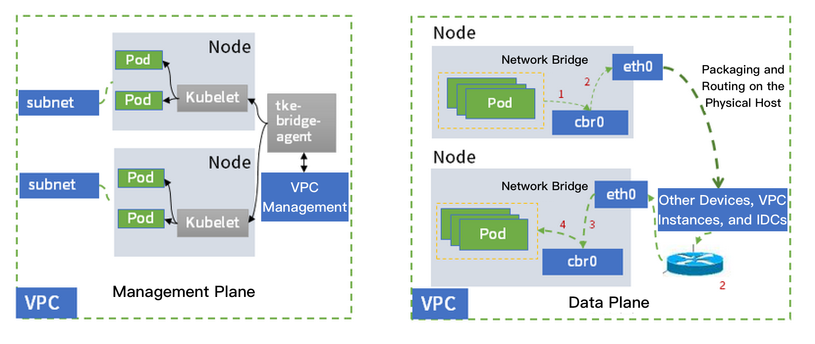 GlobalRouter 网络模式适用于常规场景,可与标准 Kuberentes 功能无缝使用。使用原理图如下所示:
