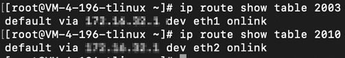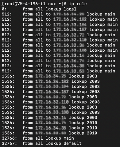 在节点上执行 ip rule 可看到策略路由表的信息,TKE 网络组件通过弹性网卡的 <link index>+2000 得到路由表号,绑定了对应网卡 IP 的 Pod 网络包都将转发到该路由表,如此例中,eth1 对应的路由表即为 2003,eth2 对应的路由表即为 2010: