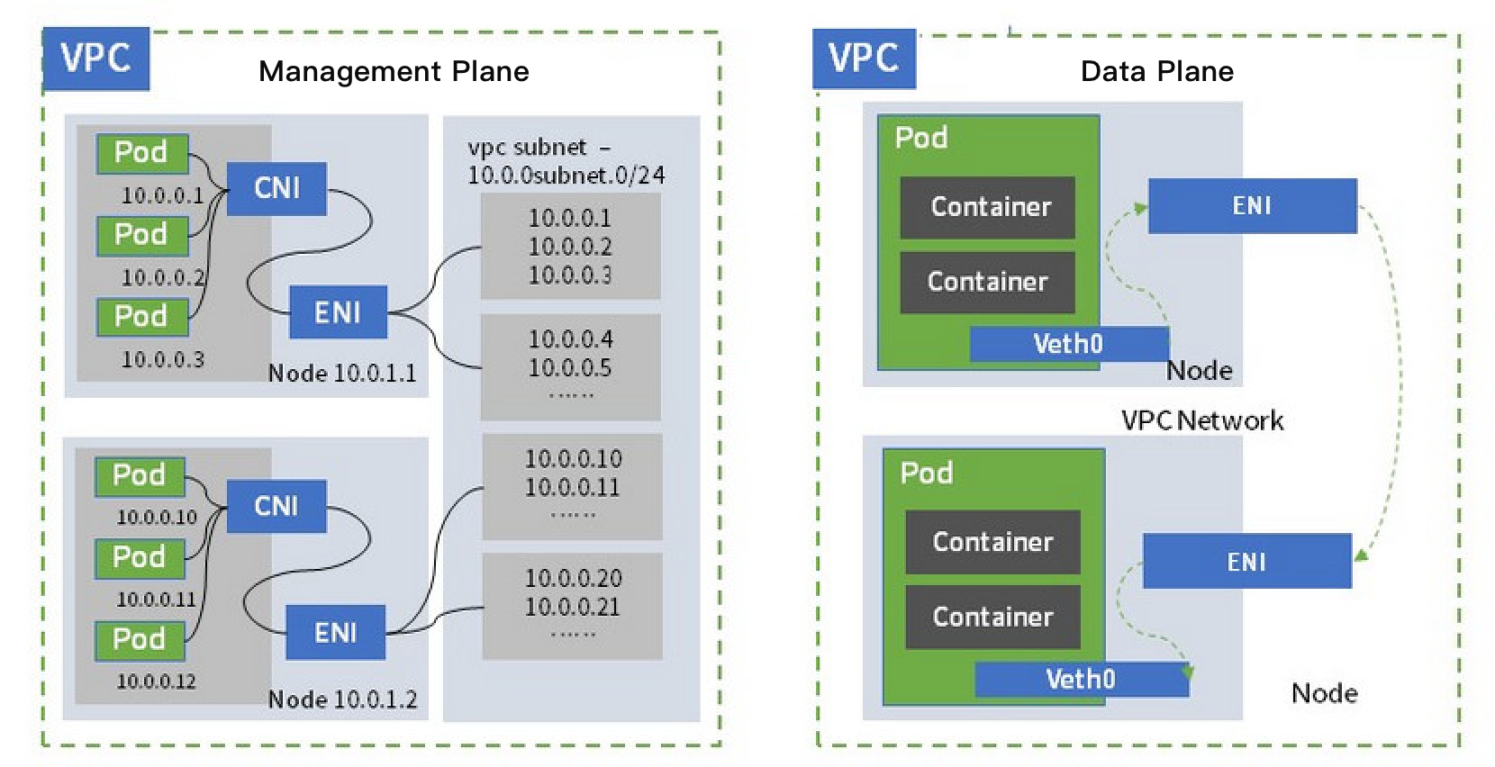 VPC-CNI 多 Pod 共享网卡模式使用原理图如下所示: